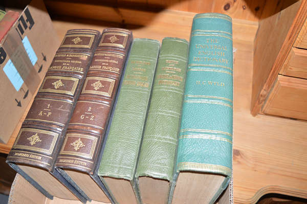 Hatzfeld & Darmsteter 'General Dictionary Of The French Language, vols. 1 and 2 in leather bindings; Malton & Legros 'French/English Dictionary', vols. 1 and 2; and H.C. Wilde 'The Universal English Dictionary', with leather bindings. (5)