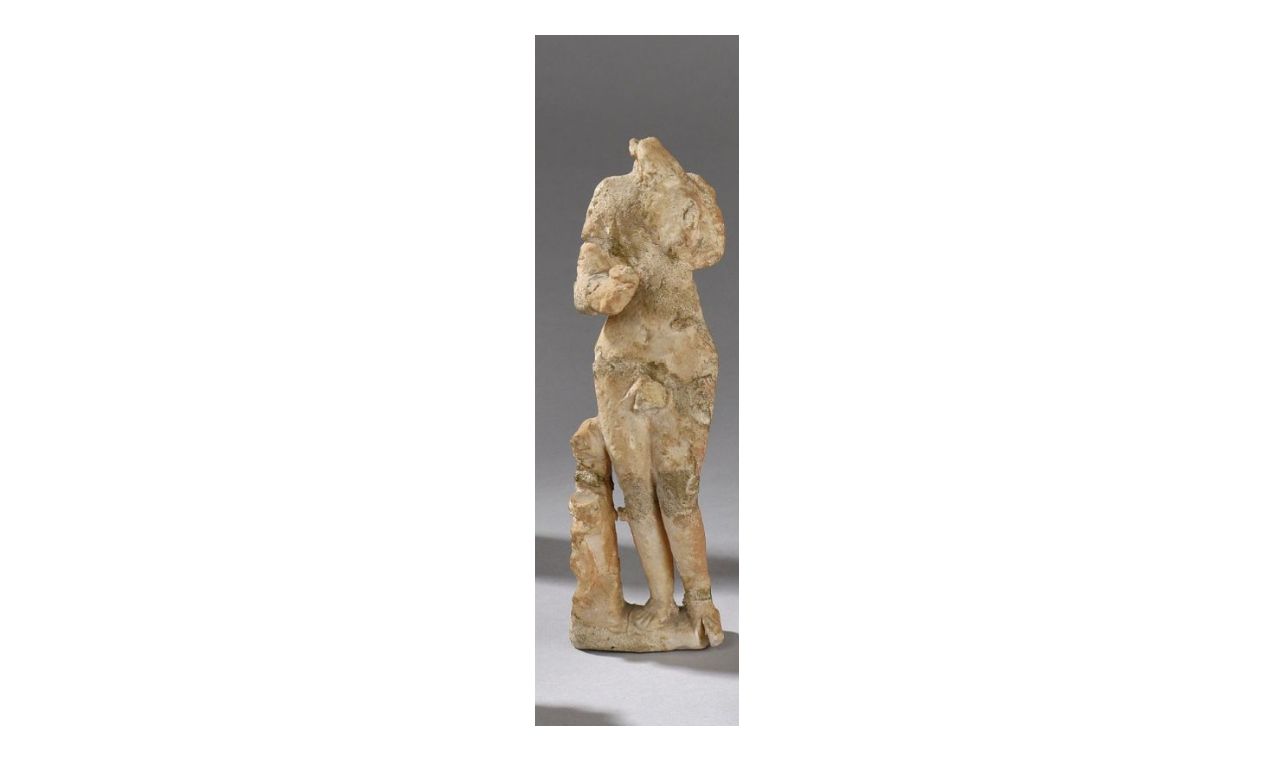 Headless statuette of the goddess Venus naked, standing, swaying gracefully. At his side, a Hermaic pillar. Calcite. Gaps. Roman