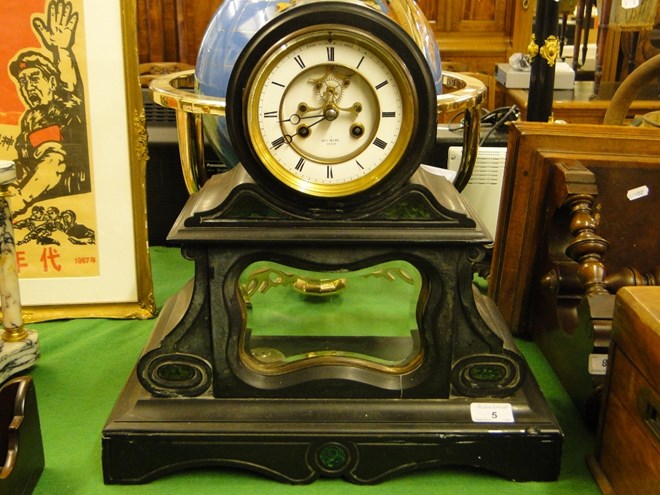 A slate mantel clock with malachite panels
