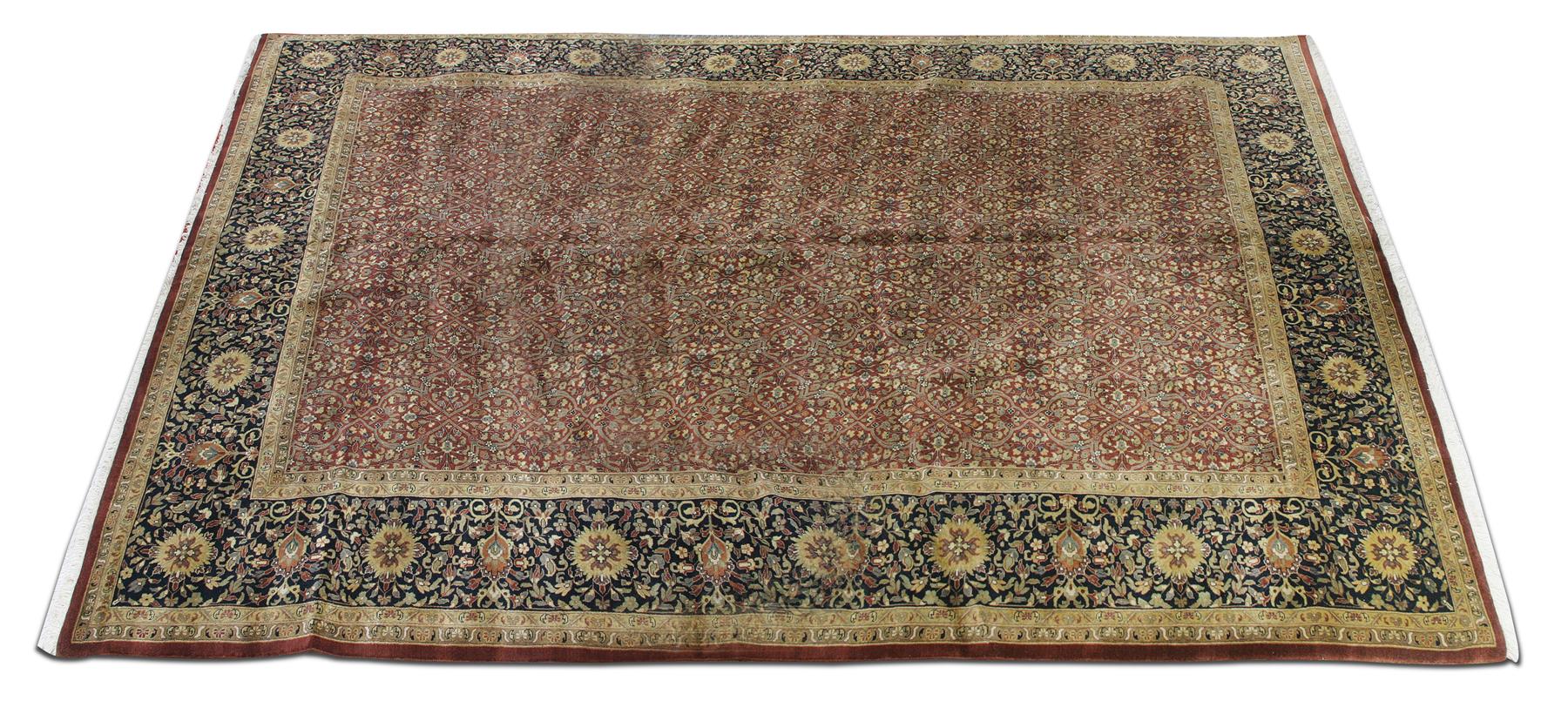 All-over naturalistic design on a brick ground set within a black border with repeating design and medallions. 9'w. 12'l.