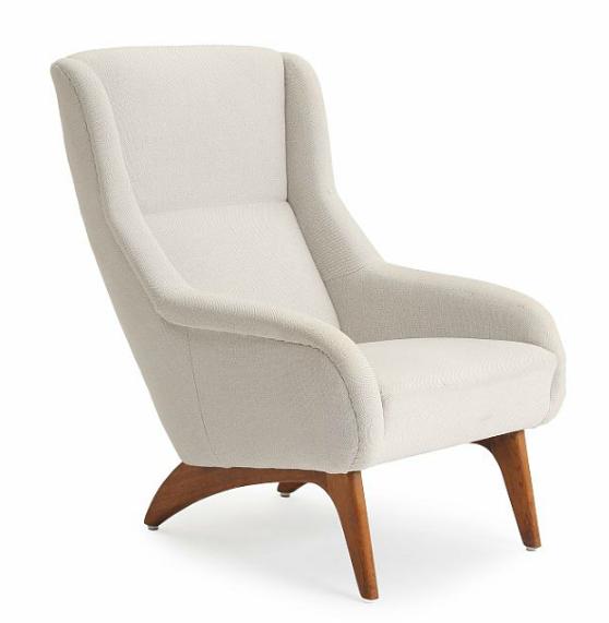 High-backed easy chair upholstered with light wool, boomerang shaped oak legs