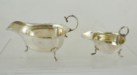 HORACE WOODWARD & CO & BLANCKENSEE & SONS TWO CHIPPENDALE STYLE SILVER SAUCE BOATS, each having a cut rim and up-scrolled handle, plain body, raised on three duck pad feet, larger Birmingham 1911, 93g, smaller Birmingham 1929, 58g