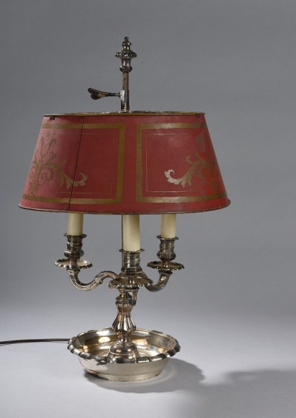 Bouillotte lamp silver bronze three lights attached to the central shaft by three scrolls. The lacquered shade red gold plate and adjustable in height.