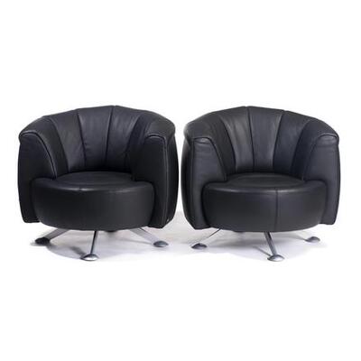 Hugo de Ruiter, two round swivel chairs De Sède, model DS-164, in black leather with 4 gray powder coated feet