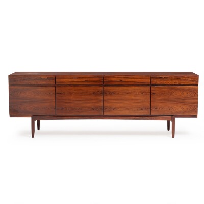 Rosewood sideboard, front with four drawers and four doors, inside with shelves and trays. Model FA 66. Manufactured by Faarup Møbelfabrik. H. 77. W. 230. D. 50 cm.