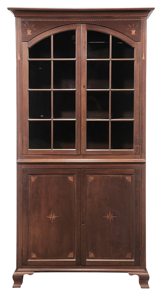 cherry and poplar with yellow pine secondary, one-piece construction with arched glazed upper doors flanked by rope and tassel and flowerpot inlay, lower doors paneled with quarter-fan and compass star inlays