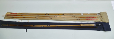 A SHARPES OF ABERDEEN Scottie impregnated split cane three piece spliced rod, #8, 12 in original makers beige cloth bag, and an ERIC PEACE SPLIT CANE ROD 1981 #7, no.221 in blue cloth bag (2)