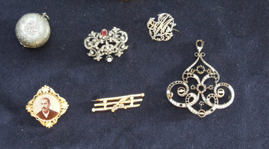 In a box: gold brooch with 6 pearls 2 shiny, Accidents, Gross Weight: 1.7 g gold brooch decorated with a photo, mother-of-pearl back. Punch head of eagle. Gross weight: 3.8 g white / yellow gold brooch / pendant with brilliants and 1 red stone. Punch