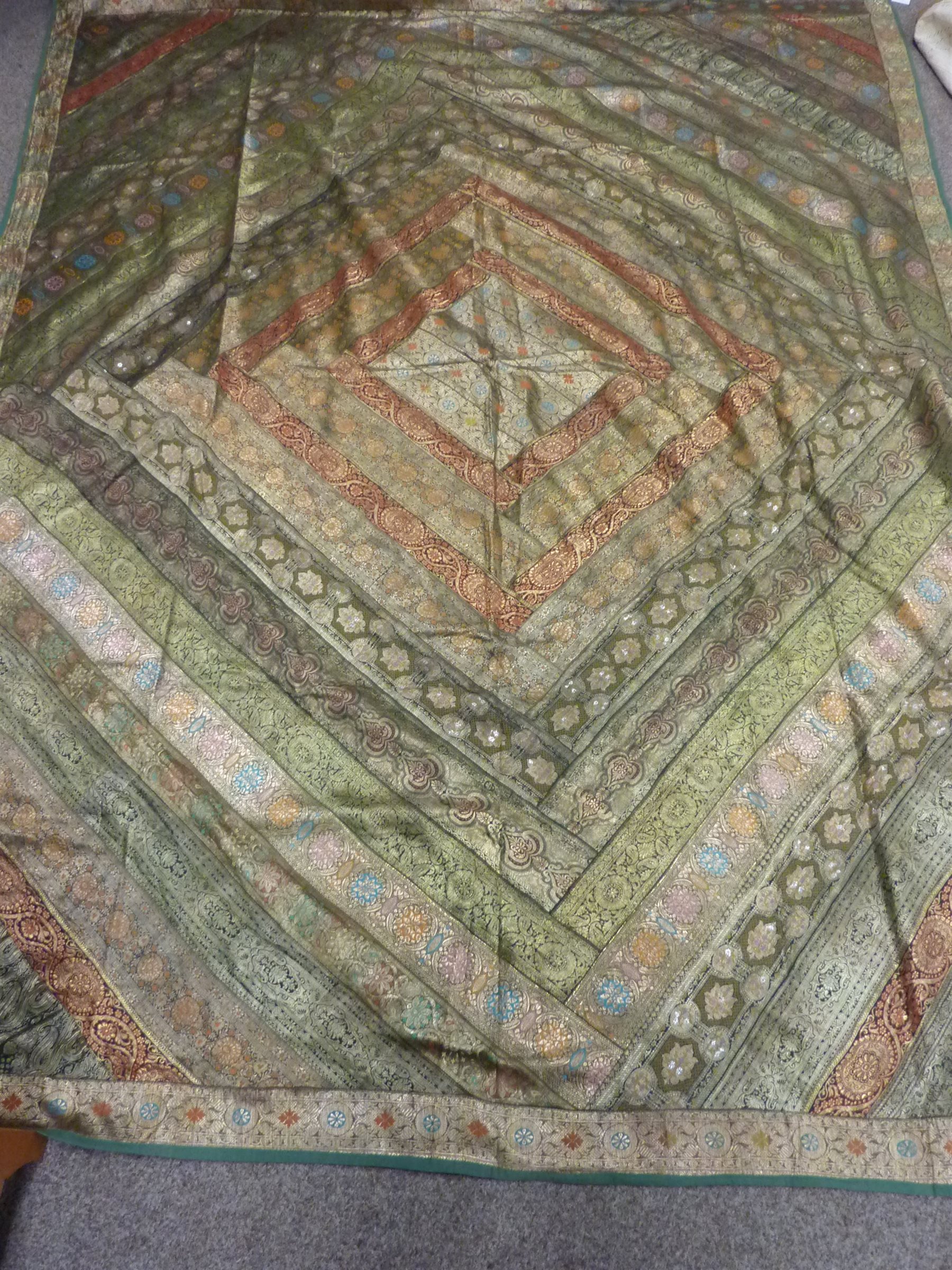 Indian embroidered silk bedspread made from sari edgings (linen backed)