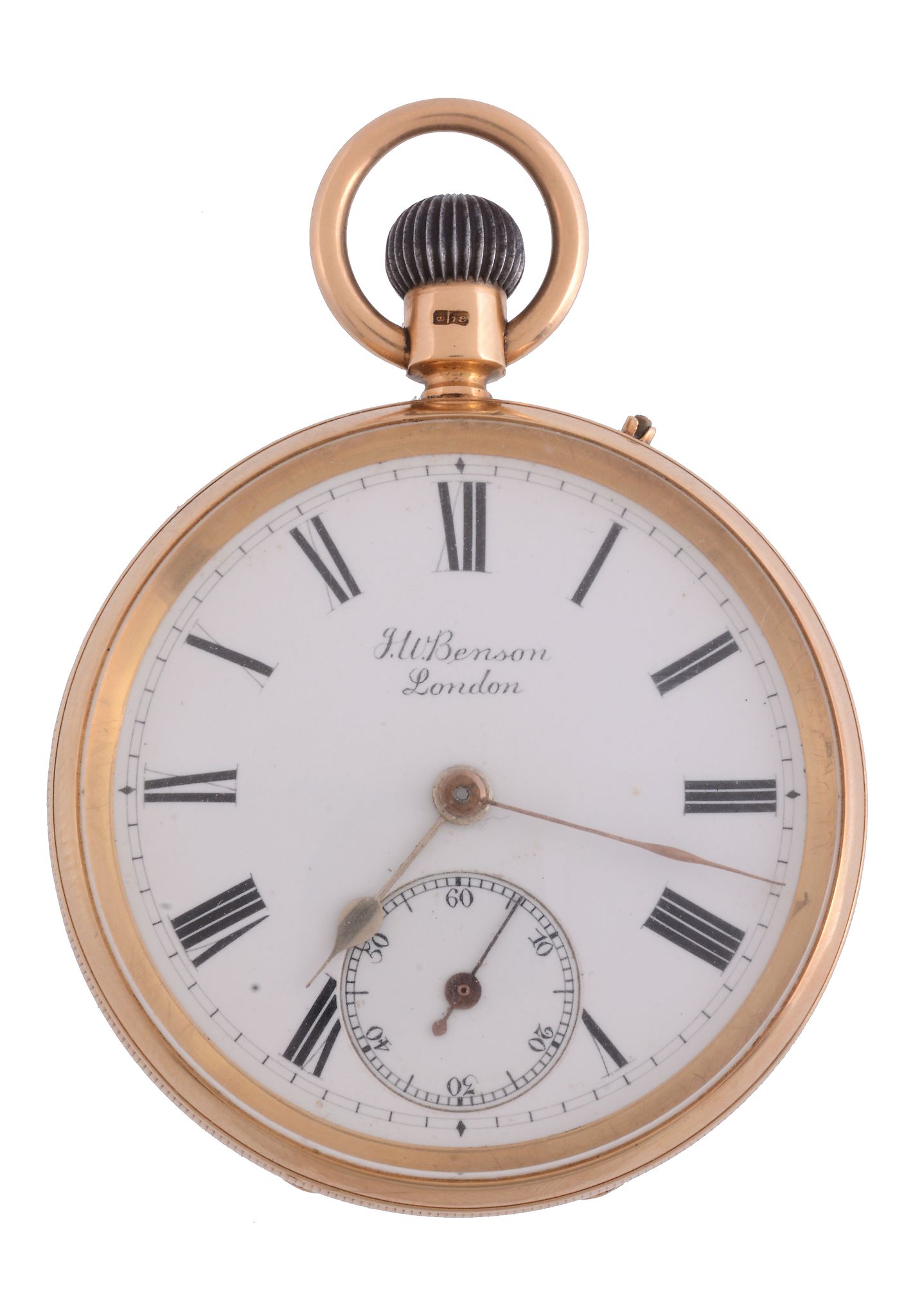 no. 952, hallmarked London 1900, three quarter plate movement, lever escapement, bimetallic split balance, engraved The Bank Watch, Best London Maker, J.W. Benson, 62 & 64 Ludgate Hill, London, No. 894786, white enamel dial, black Roman numerals, spa