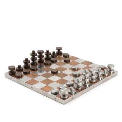 A stainless steel and copper chess-board with stainless steel and bronze chess-pieces.