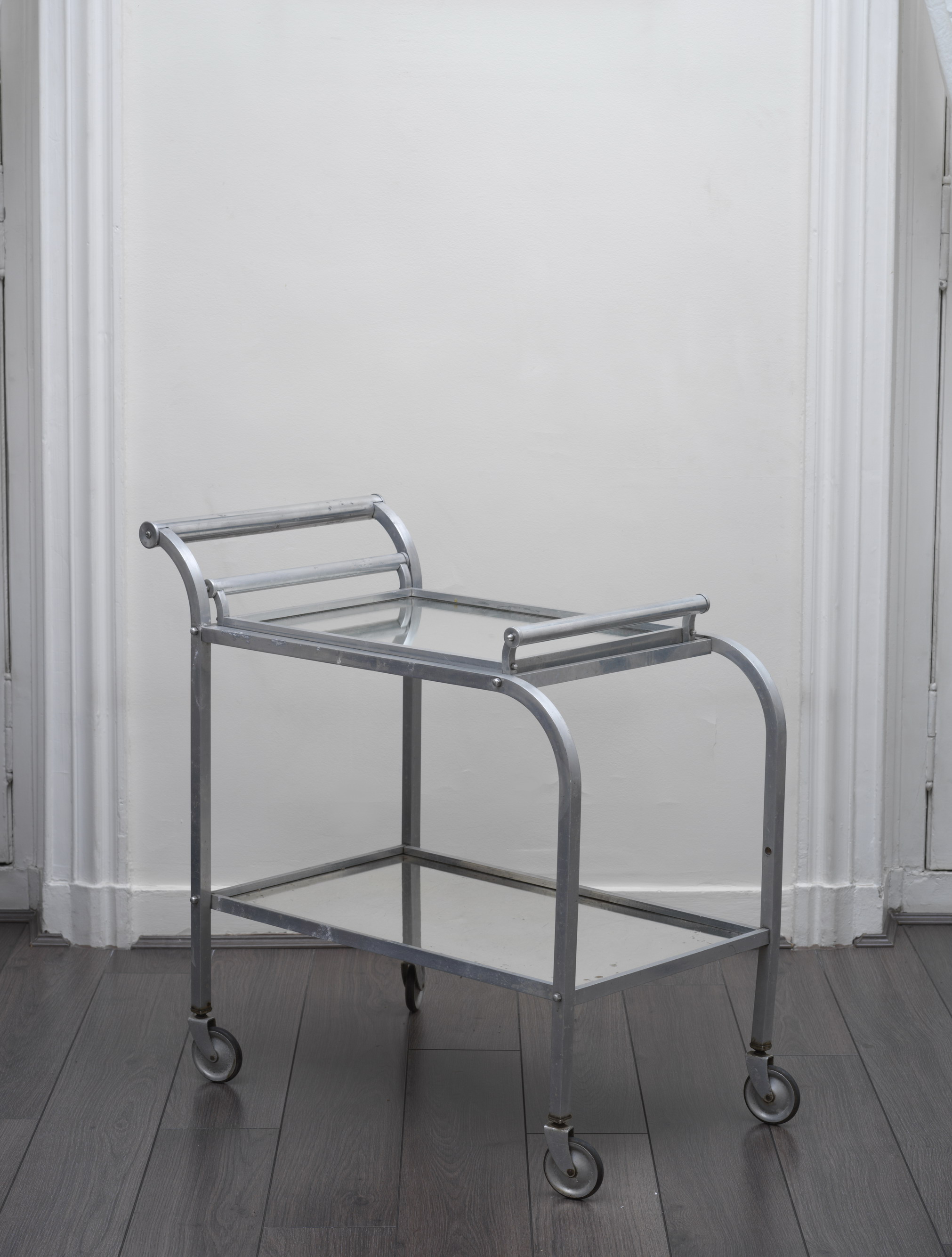 Chrome-plated metal square section structure, removable top tray, cylindrical handles in transparent Plexiglas, mirror-bottomed trays. As it is