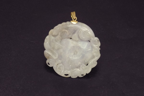 Jade pendant carved with plant motifs. With reasa yellow gold 18 K. 51 mm. diameter