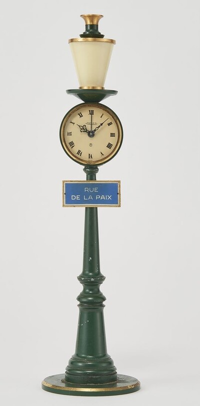 Cream dial, blue needles, black Roman numerals, hour counter at 12 o'clock, alarm, 8 days, green lacquer and gold metal, H 28 cm, D 47 mm