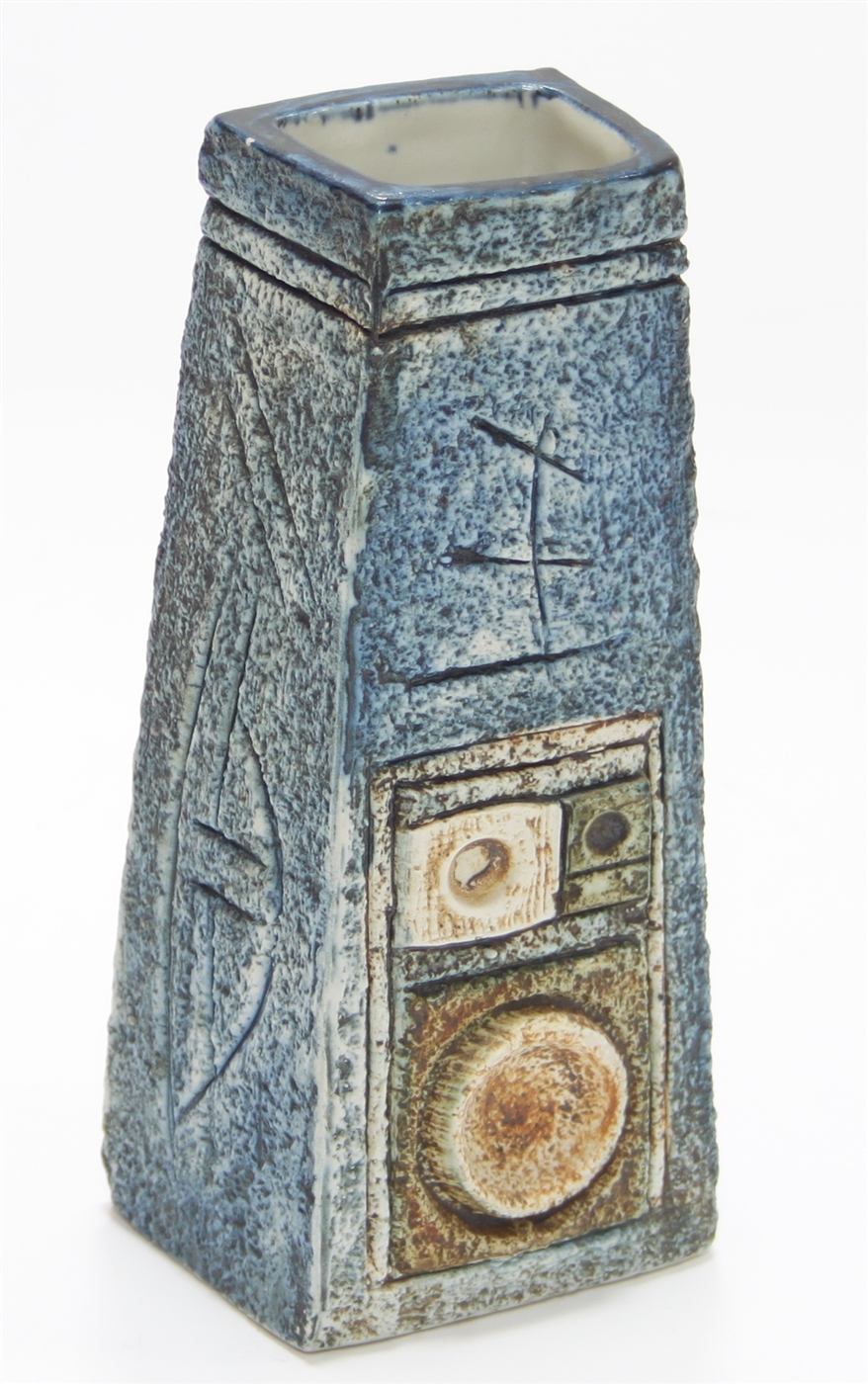 Jane Fitzgerald for Troika/A pottery coffin vase with applied and incised decoration in blues and green