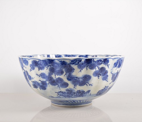 Japanese blue and white rose bowl, lightly fluted, decorated with pine trees