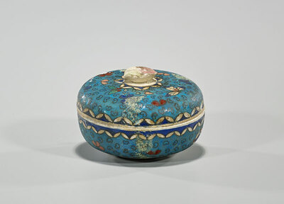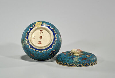 Japanese Meiji Period cloisonné enamel on porcelain covered dish; of squat globular form, with peach finial; exhibiting butterfly and floral motifs on a blue ground; signed to base; Provenance: Collection of Yoshiko Faye Osako-Nakamura; D: 5 1/4" (ap