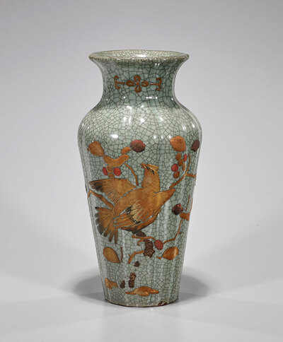 Japanese gilt lacquered crackle-glazed vase; of lobed form; showing birds amid fruit and foliage; Provenance: Collection of Yoshiko Faye Osako-Nakamura; H: 13 1/2" (approx.)