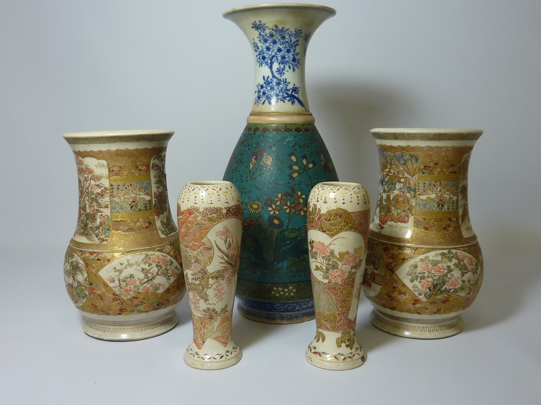 eight character mark to base H29.5cm and two pairs of 19th/early 20th century Japanese Satsuma vases H18.5cm and 15cm (5)