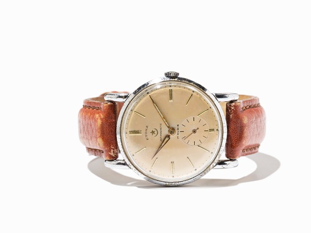 Manual wind movement, 17 rubies; hour, minute, small second Gold dial, gold colored hands with luminous material, line indices Watch case and crown of stainless steel, pin buckle of gold-plated stainless steel, strap of leather Watch case number: 344