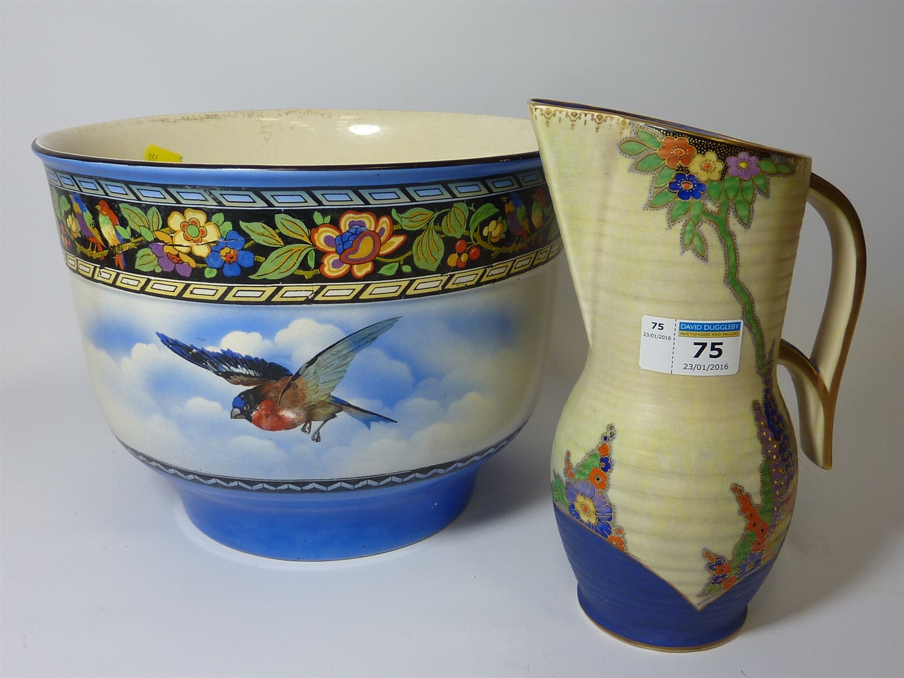 Jardiniere decorated with birds and foliage and a Crown Devon Fieldings jug (2)