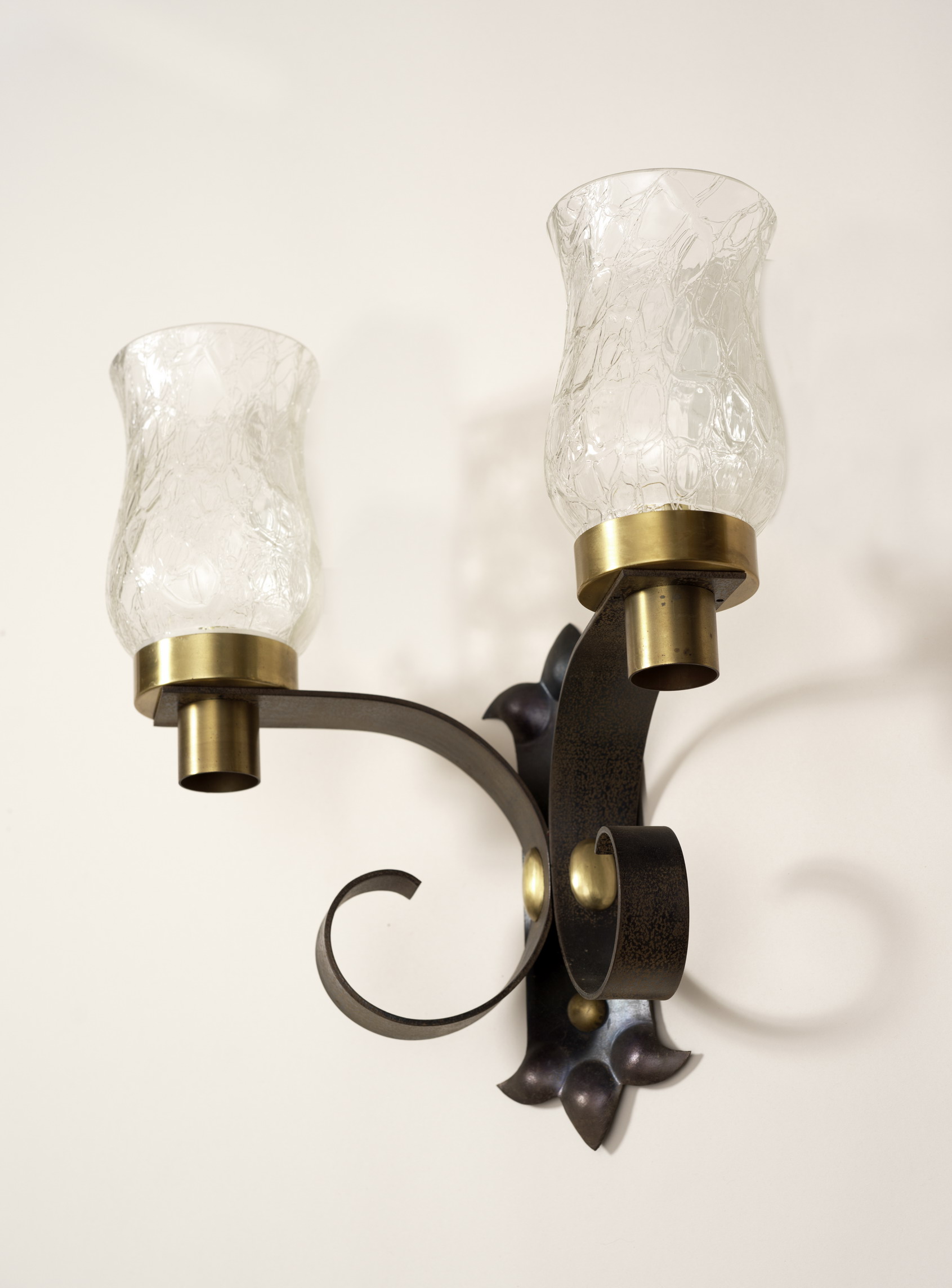 PERZEL -Ensemble de 7 appliques doubles composées d'une embase en fer forgé flambé, verreries craquelées garnies d'un manchon en verre diffusant, supports verres en laiton et fer forgé - Egrenures - Hauteur 46 cm Largeur 40 cm Saillie 20 cm - Egrenur
