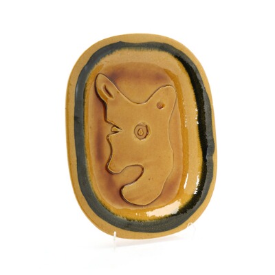 A stoneware dish decorated in yellowish glaze. Marked B. Politikkens Særtryk, Tommerup 2002. No. 137.