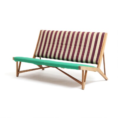 “JH 555”. Freestanding two seater sofa bench with oak frame and splitted front legs, seat recently upholstered with nail fittted green wool, back upholstered with original striped wool. Designed 1949. This example made 1950's by cabinetmaker Johannes