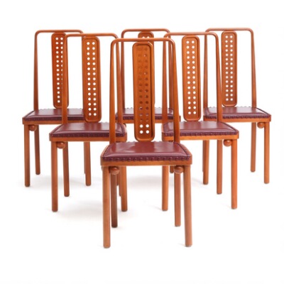A set of six mahogany chairs upholstered in seats with reddish leather