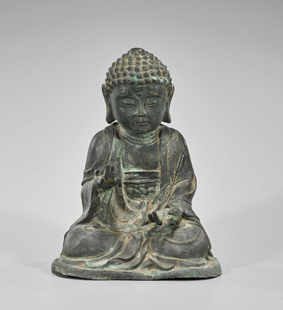 Korean Joseon Dynasty bronze figure of Amitabha Buddha; seated in dhyanasana, the hands raised in mudra; the face finely cast in serene expression, framed by well-detailed snail-curl hair surrounding a central ushnisha; H: 9 3/4"
