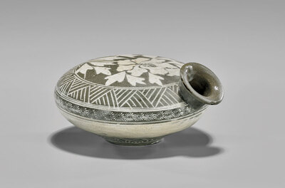 Korean Joseon Dynasty buncheong pottery vessel; finely potted, of compressed globular form, tapering sharply to a narrow foot; with short, flared neck to one side; the top centering a floral medallion encircled by geometric and foliate bands; W: 7" (