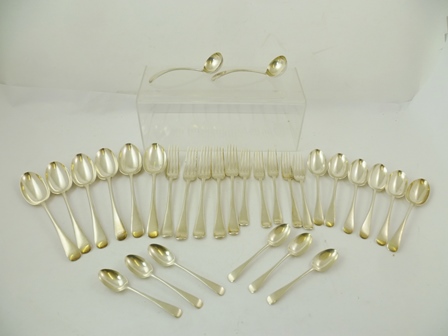 JOSIAH WILLIAMS & CO (David Landsborough Fullerton) A PART SET OF SILVER FLATWARE, Hanoverian pattern, London, mixed assays, years around late 1920s early 30s, combined weight 1,650g comprising; six table/soup spoons, five dinner forks, five dessert
