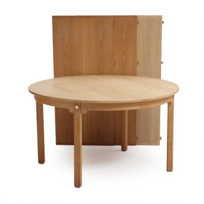 Circular dining table of oak with extension and three extra leaves, one with apron.