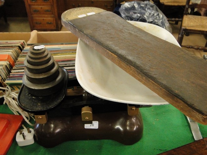 Kitchen scales and weights and a Holborn knife polishing board
