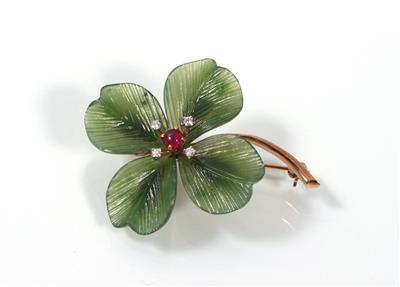 Gold 585, geschnittene Nephrit-blätter, Rubincabochon, Brillanten, 8,3 gøG4