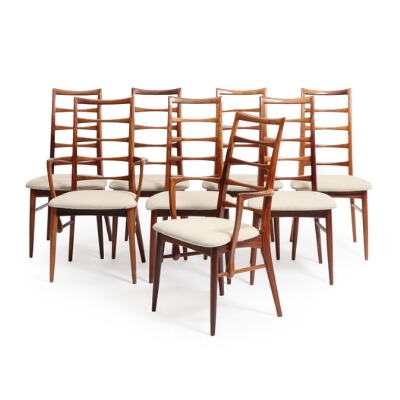 “Lis”. A pair of rosewood high-backed armchairs and six High-backed side chairs, upholstered with light wool in seats. Manufactured by Koefoeds Møbelfabrik, Hornslet. (8)