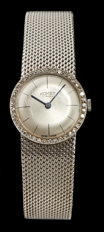 Gray dial, blue hands, black baton indexes, 750 white gold, D 23 mm, L 16.5 or 17 cm, gross weight 45 g