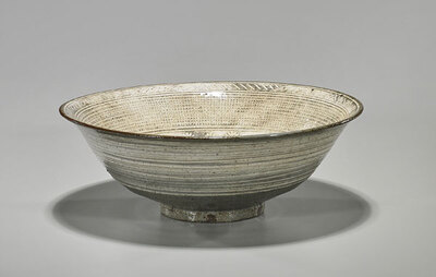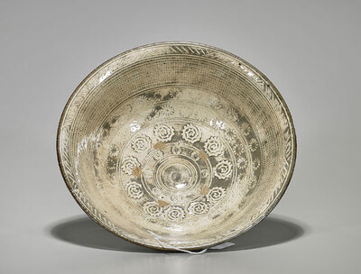 Korean buncheong bowl; of wide deep form, with flared rim and stepped base; the interior showing concentric bands of floral and geometric motifs; D: 10 3/4" (approx.)