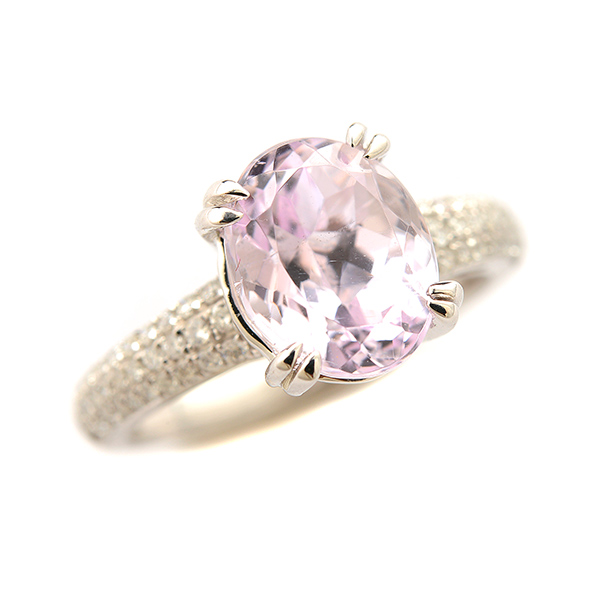 Featuring one oval-cut kunzite weighing approximately 3.50 cts., accented by numerous round-cut diamonds weighing a total of approximately 0.25 cttw., set in a 14k white gold mounting.
