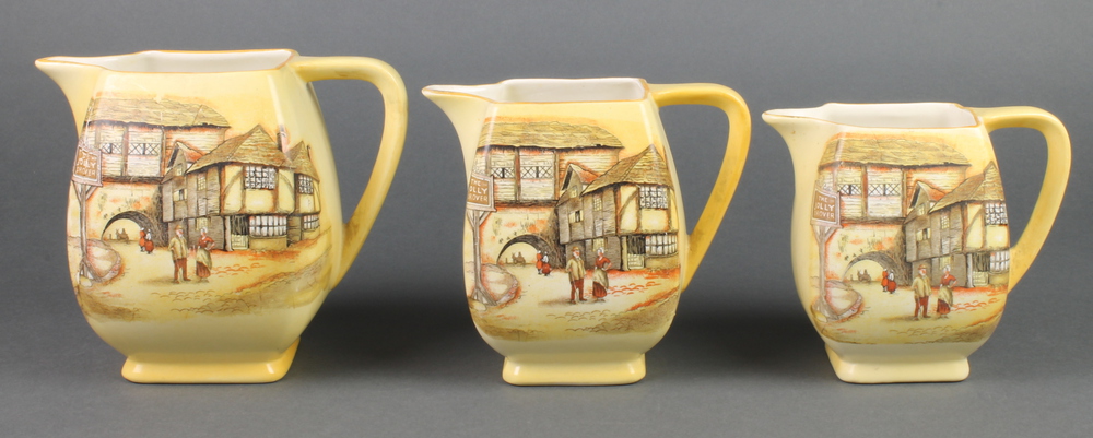 3 1930's L & Sons square pottery jugs decorated The Jolly Drover 6", 5 1/2" and 5"