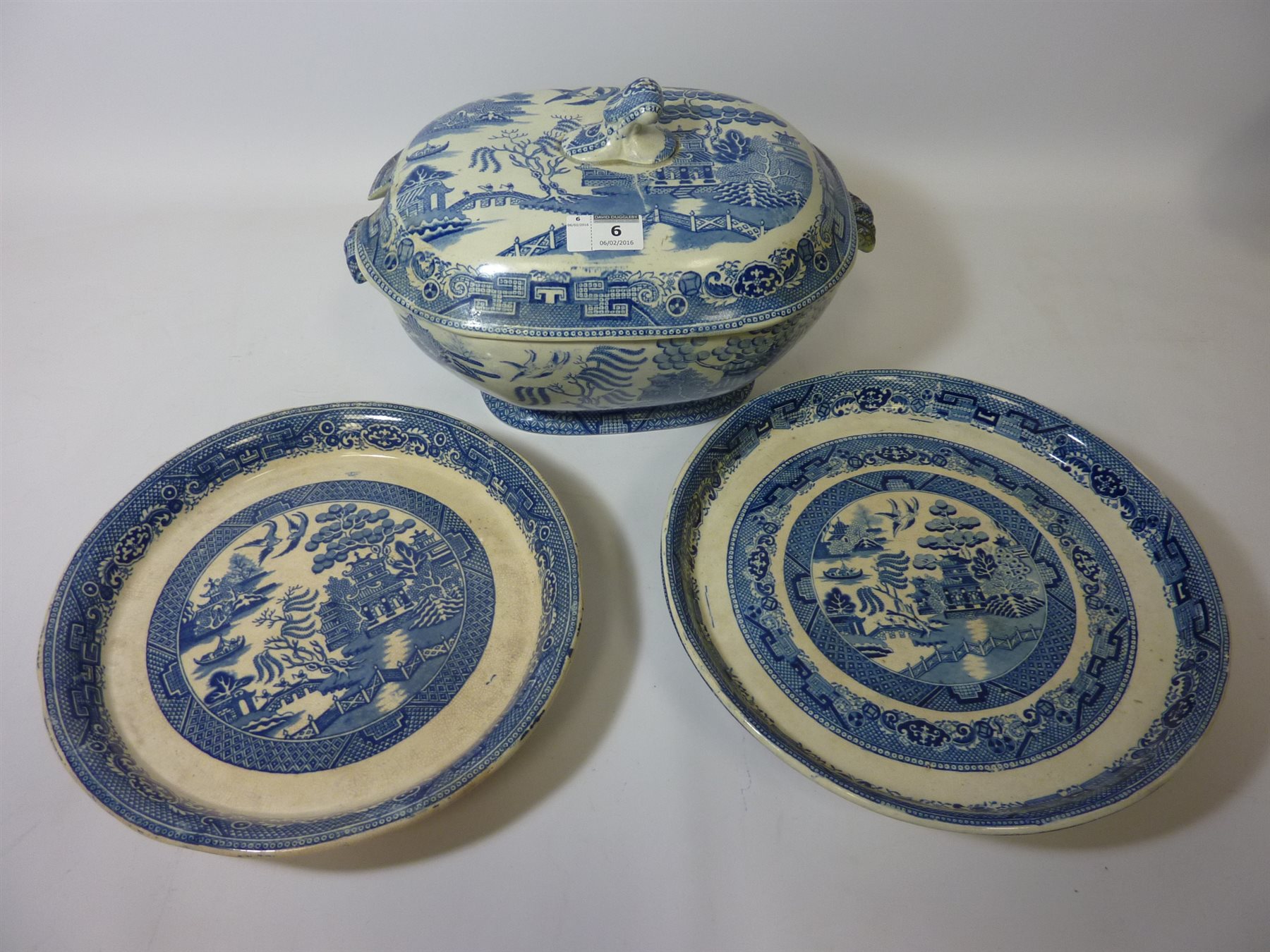 Large 19th Century Willow pattern tureen 21cms H. and two 19th Century Willow pattern pedestal dishes