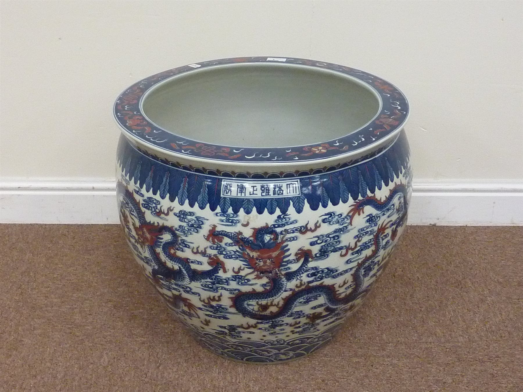 Large 20th century Chinese blue and white fish bowl decorated with dragons