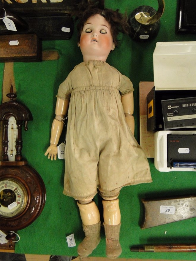 Large Antique German doll with jointed painted wooden limbs and porcelain head with sleeping eyes
