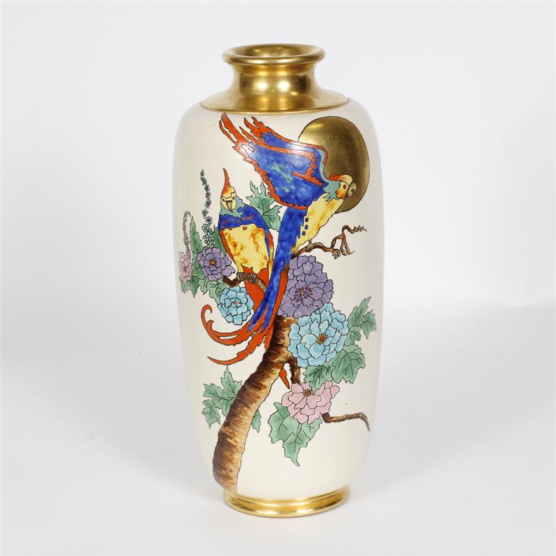 Large Art Deco American China Painters Satsuma porcelain vase with Parrots and Flowers Drilled base for lamp