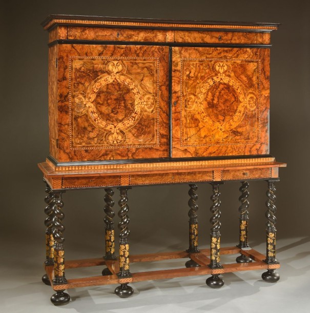 Large cabinet in walnut, ivory and exotic wood veneer and marquetry of flowery wreaths and nets drawing out perspectives. It opens to two large leaves and two drawers in the headband. Open, they discover a rich interior composed of two wings framed b
