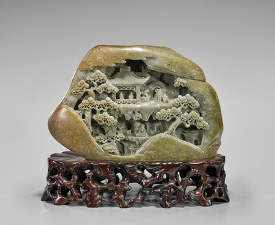 Large Chinese carved celadon jade mountain; the large boulder-form with an inset multi-layered figural scene to the front, depicting sages around a garden filled with pavilions, gates, and rockery all tucked amid pine trees; the stone of mottled cela