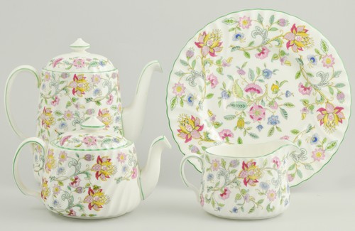 to include eight dinner plates, a circular serving dish, eight side plates, twelve large dinner plates, eight soup bowls, two gravy boats, milk jug, large milk jug, small tea pot, coffee pot, large tea pot, fourteen tea cups, two tier cake stand, lar