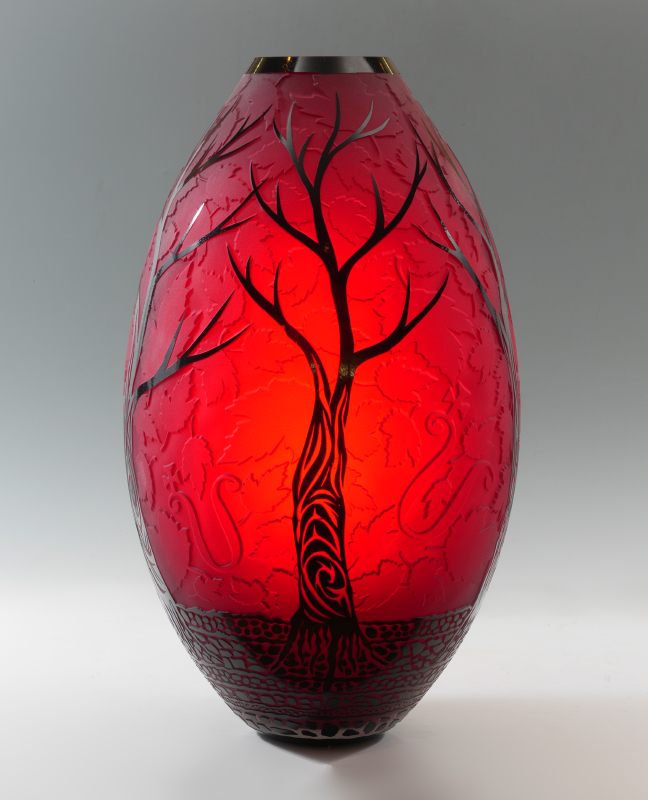 Red ground with cameo foliate motifs, black figural trees and base with rocks