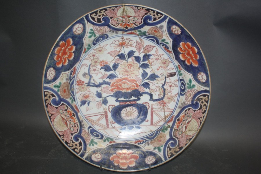 Large round dish with Imari decor of a vase with flowers and stylized motifs
