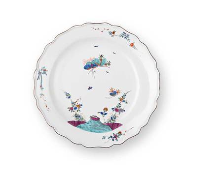 Polychrome Kakiemon painting with insects. Brown border line. Blue swords Meissen, 1735. Restored. Ø 43.5 cm